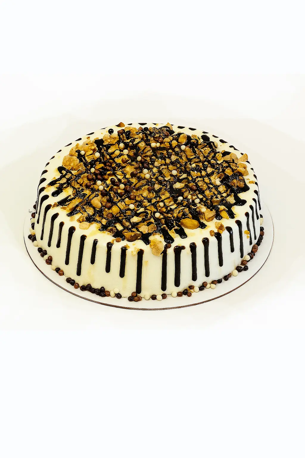 An indulgent universe of crunch and cream! The Chocolate Galaxi cake is topped with a galaxy of roasted nuts, crunchy pearls, and rich chocolate drizzle over a silky vanilla base. Each bite delivers layers of texture and taste – sweet, nutty, and satisfyingly rich.